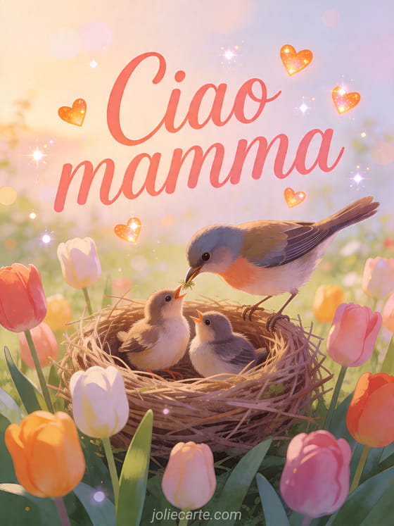 Condividi questo affettuoso biglietto di ciao mamma con una mamma uccello che nutre i suoi piccoli, tulipani colorati e dolce calore di famiglia. Puoi anche scoprire sms buongiorno amichevole, buongiorno al proprio innamorato e meme buongiorno.