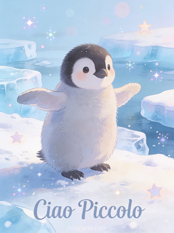 Condividi una deliziosa cartolina di ciao piccolo con un pinguino cucciolo che sbatte le sue piccole ali in una scena antartica innevata con morbido ghiaccio blu. Scopri anche una cartolina ciao piccolo pappagallino, una cartolina ciao sole o una cartolina caro ciao.