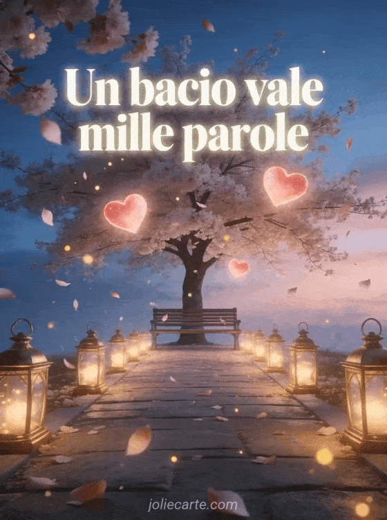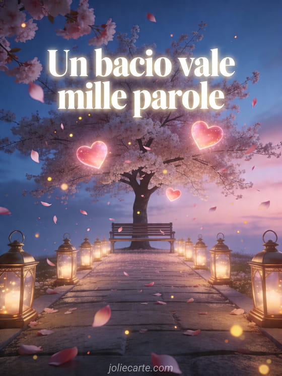 Celebra l'amore con questo biglietto gratis con citazione sui baci ispirato alla luce delle lanterne, ai fiori di ciliegio e a un sentiero da sogno al crepuscolo. Scopri anche pagina bacio tenero, tenerezza cuore baci buona notte o immagine baci teneri.