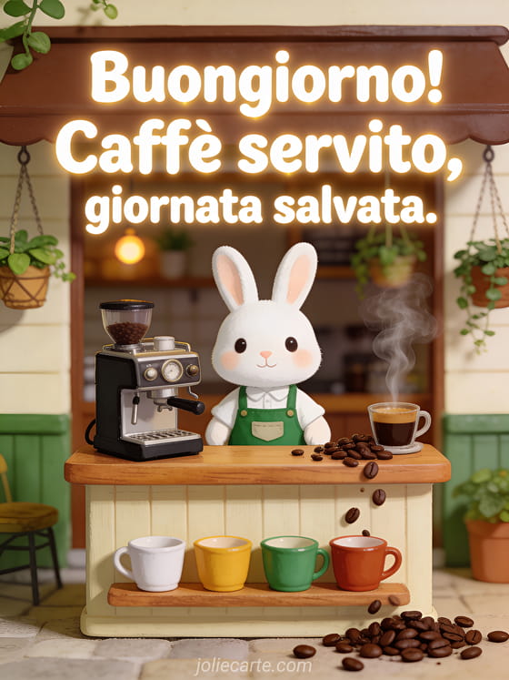 Inizia la mattina con questa citazione divertente di buongiorno con un coniglio barista che salva la giornata. Guarda anche gif gratis buongiorno umoristici o immagine divertente buongiorno.