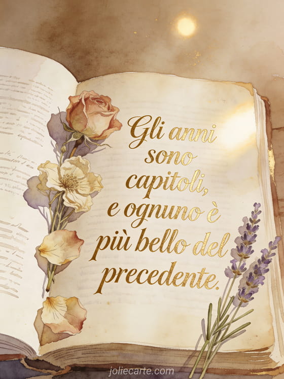 Festeggia il suo compleanno con questa poetica citazione: "Gli anni sono capitoli, e ognuno è più bello del precedente." Questo biglietto presenta un libro aperto con fiori secchi, petali di rosa e rametti di lavanda in una raffinata illustrazione ad acquerello. Scopri anche un buon compleanno donna elegante o un testo per un compleanno donna.