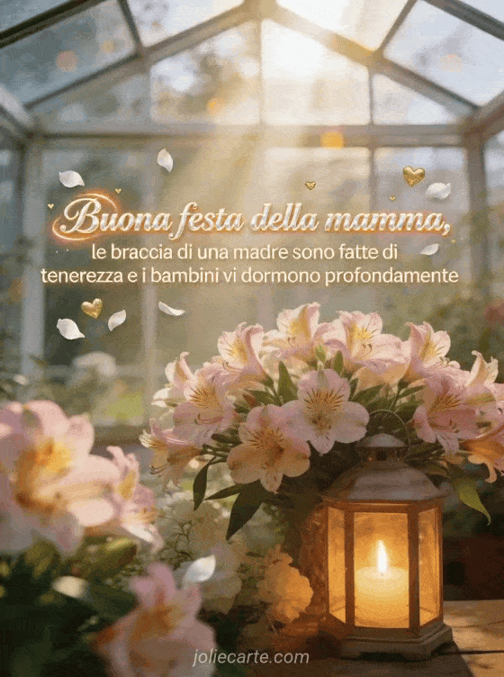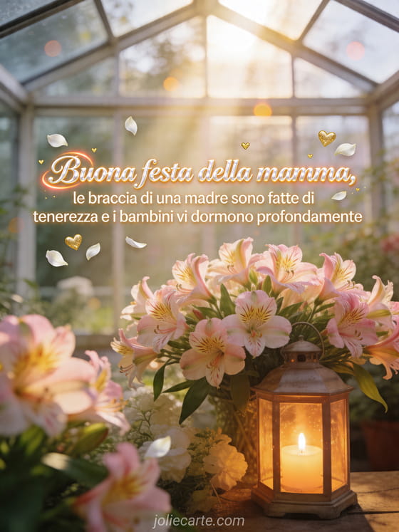 Condividi un biglietto tenero per la festa della mamma con scrittura perlata, petali bianchi, cuori dorati, alstroemeria e una lanterna con candela luminosa in una serra chiara. Scopri anche una citazione per la festa della mamma, un biglietto per la festa della mamma o immagini gratis per la festa della mamma.