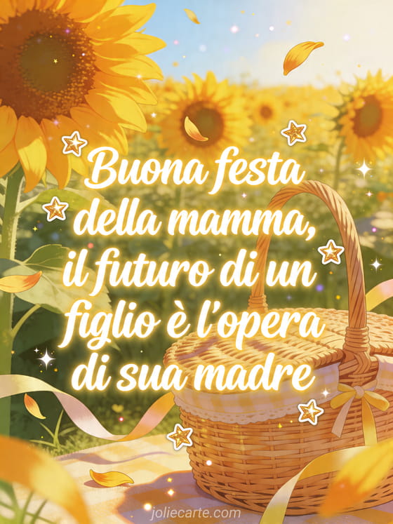 Condividi citazioni sulla festa della mamma in un biglietto illustrato radioso con girasoli dorati, cestino da picnic intrecciato, nastri al vento, piccole stelle e petali di girasole. Scopri anche messaggi sulla festa della mamma, fotografia della festa della mamma o un disegno per la festa della mamma.