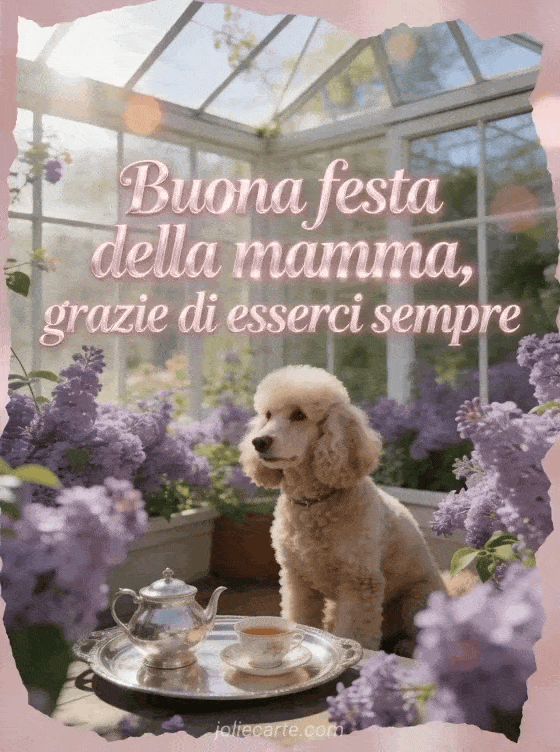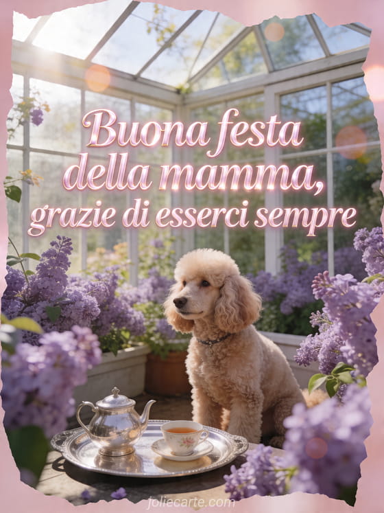 Ringrazia la mamma con un biglietto luminoso che mostra un barboncino fotorealistico in una serra piena di lillà accanto a un vassoio da tè argentato. Puoi inviare anche foto per la festa della mamma, un poema della festa della mamma o poesia per la festa della mamma.