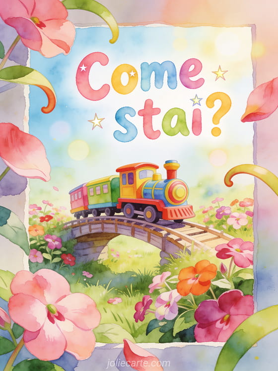 Invia un saluto giocoso con lettere rotonde ad acquerello, un trenino giocattolo colorato che attraversa un piccolo ponte nel prato e petali di impatiens oltre il bordo. Scopri anche un ciao tesoro mio come stai, un biglietto come stai figlia mia o un saluto come va tesoro mio.
