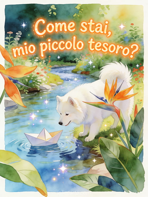 Chiedi con calore giocoso grazie a scritte arancioni, fiori di strelitzia, un cane Samoiedo accanto a una barchetta di carta piegata e un ruscello da giardino scintillante. Scopri anche un buongiorno amore mio come stai stamattina, un biglietto come va il mio tesoro o un saluto sì sto bene tesoro mio.