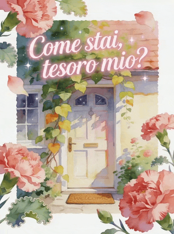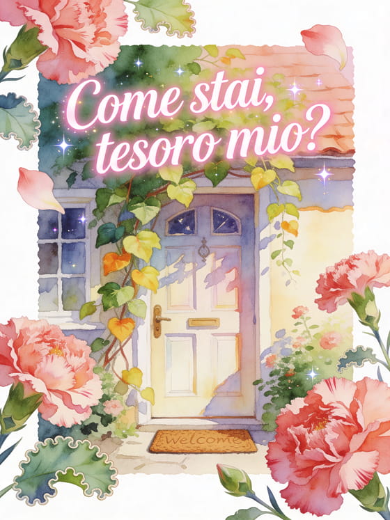 Chiedi con tenerezza grazie a scritte rosa ad acquerello, garofani attorno a una porta di casa dipinta, foglie rampicanti e un piccolo zerbino alla luce del giorno. Scopri anche un buongiorno come stai oggi, un biglietto buonasera tesoro mio come stai o un saluto ciao come stai oggi.