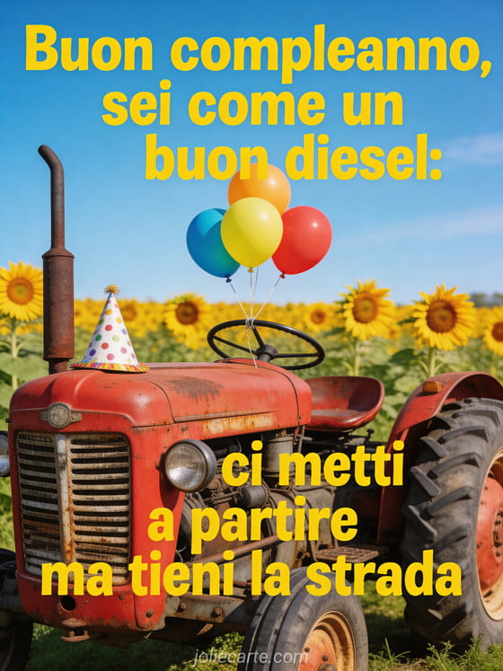 Condividi questa cartolina di compleanno ironica con un vecchio trattore simpatico, palloncini colorati e battute sull'età. Scopri anche gif compleanno uomo umorismo gratis, buon compleanno uomo umorismo gif e bel biglietto compleanno uomo.