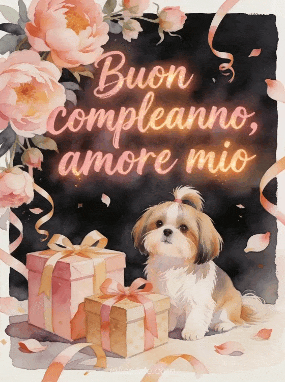 Festeggia il tuo amore con un caldo biglietto di compleanno in acquerello, con un grazioso shih tzu accanto a regali avvolti da nastri sotto peonie a cascata. Petali e stelle filanti attraversano il bordo con un bagliore romantico e festivo. Scopri anche un biglietto buon compleanno amore mio, un buon compleanno amore mio immagine o un gif animato buon compleanno cuore mio.