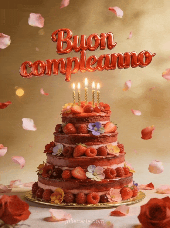 Festeggia con una cartolina di compleanno animata con una torta spettacolare a cinque piani, frutti rossi e candele dorate. Scopri anche compleanno immagini animate, biglietto compleanno bambino gratis animato e cartolina virtuale compleanno animata gratis.