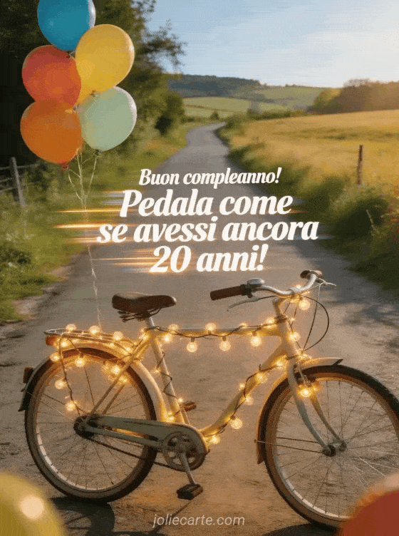 Invia questo biglietto di compleanno con bicicletta e umorismo — una bici vintage decorata con ghirlande e palloncini su una strada di campagna soleggiata. Scopri anche umorismo animato di buon compleanno o immagine compleanno con umorismo.