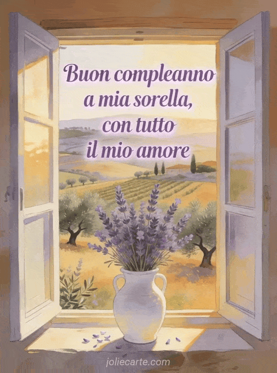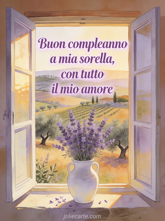Condividi questo biglietto fotorealistico per tua sorella con bouquet di lavanda, finestra aperta e paesaggio estivo sereno. Scopri anche compleanno mia sorella, biglietto buon compleanno sorella grande e buon compleanno sorella del mio cuore testo.