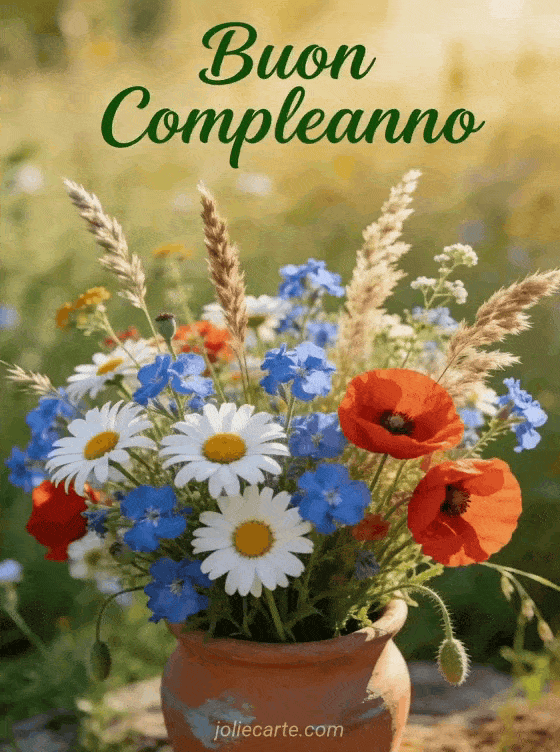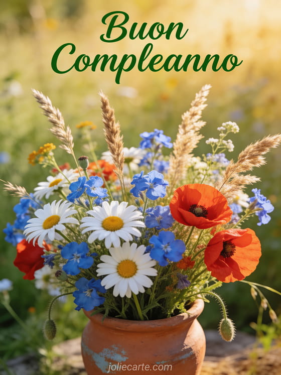 Festeggia il suo compleanno con questo incantevole biglietto con un magnifico mazzo di fiori di campo, margherite, fiordalisi e papaveri in un vaso di terracotta nella luce dorata. Scopri anche un biglietto compleanno donna con peonie, un mazzo di buon compleanno per donna o un biglietto compleanno donna acquerello.