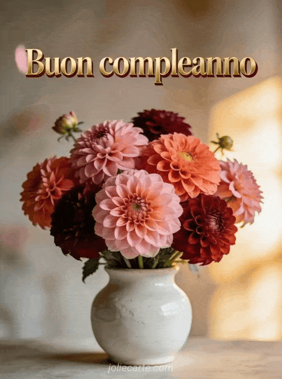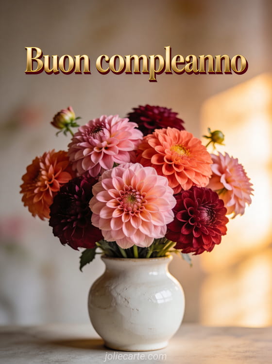 Condividi una cartolina di compleanno raffinata con splendide dalie e un'atmosfera calda e morbida. Scopri anche buon compleanno donna immagine, compleanno donna immagine e messaggio biglietto compleanno donna.