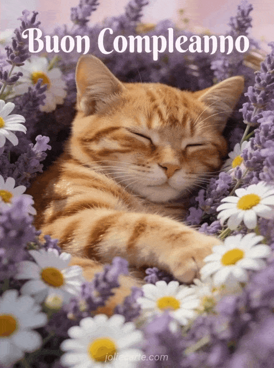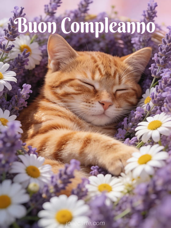 Festeggia il suo compleanno con questo adorabile biglietto che presenta un simpatico gatto tigrato rosso che dorme pacificamente in un letto di fiori di lavanda e camomilla, con luce soffusa e rilassante in stile fotorealistico. Scopri anche un testo compleanno donna o una citazione compleanno donna.