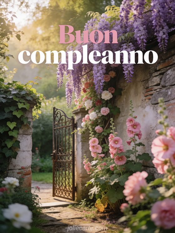 Condividi una splendida cartolina animata di compleanno con una cascata di fiori su un antico muro di pietra con glicini e malvarose. Scopri anche cartolina compleanno animata musicale o buon compleanno animato.