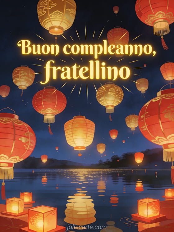Condividi un biglietto magico di compleanno per tuo fratello con centinaia di lanterne cinesi rosse e dorate che salgono in un cielo notturno profondo, riflesse in un lago calmo. Puoi inviare anche un citazione compleanno fratello, un mio fratello buon compleanno fratellone umorismo o un buon compleanno fratellino.