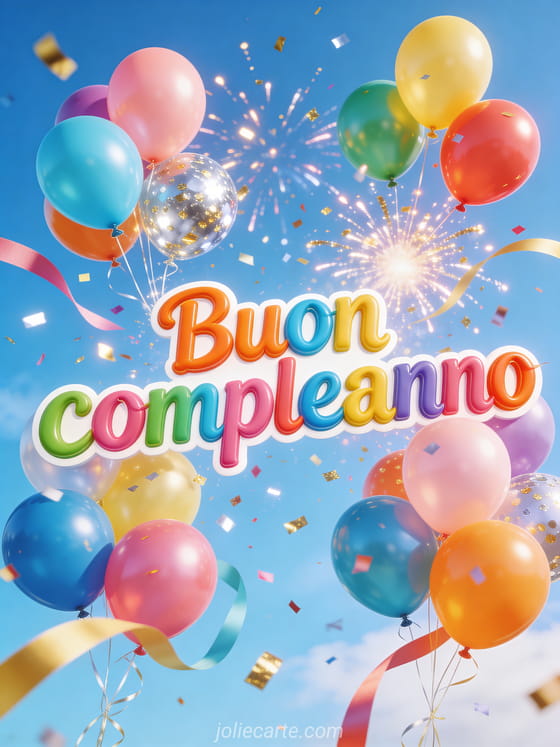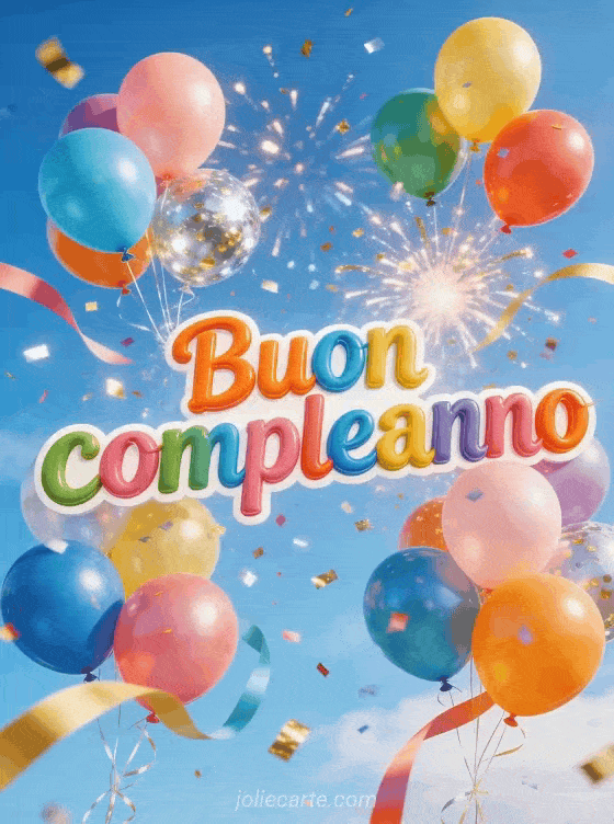 Invia questo gioioso gif animato di compleanno con palloncini colorati e un'esplosione di coriandoli dorati e argentati in un cielo brillante all'aperto. Scopri anche un biglietto di compleanno animato gratis o un buon compleanno gif animato.
