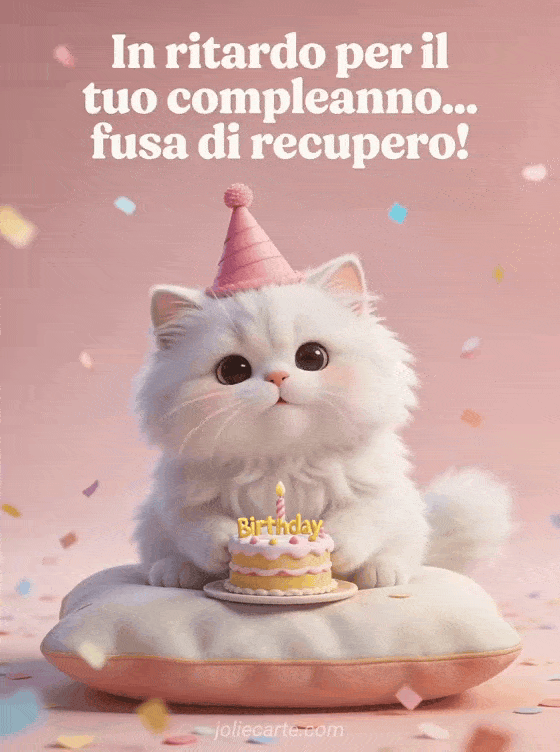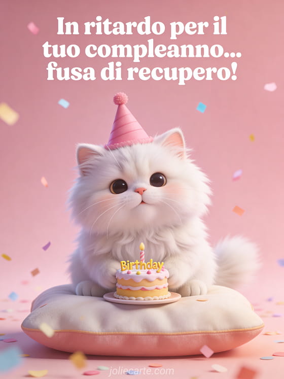 Recupera un compleanno in ritardo con un dolce biglietto in stile 3D con un gatto persiano bianco e soffice con cappellino da festa rosa, un morbido cuscino, una torta di compleanno in miniatura, coriandoli pastello e sfondo rosa cipria. Puoi inviare anche un biglietto di buon compleanno in ritardo per un uomo, un biglietto di buon compleanno in ritardo testo o una gif gratis compleanno in ritardo.