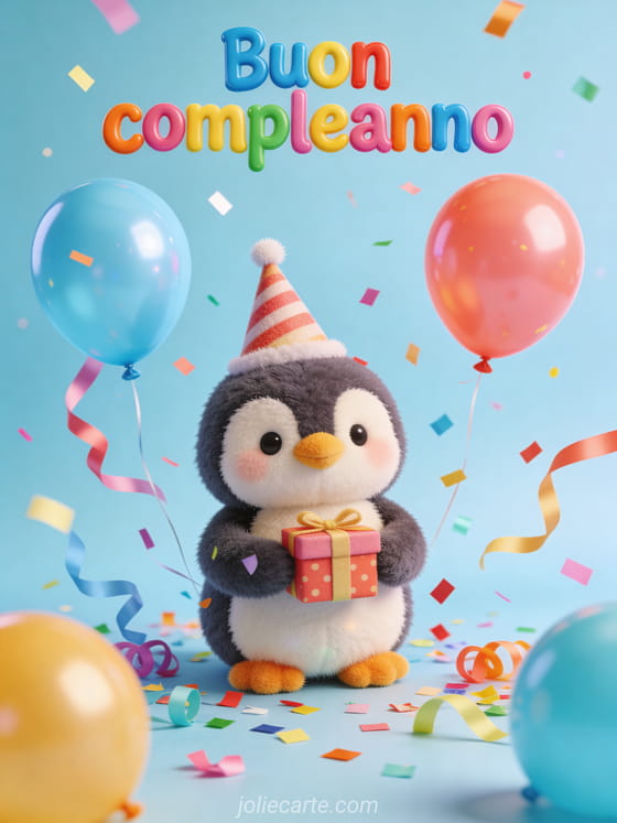 Invia un'immagine gioiosa di compleanno a tua nipote con un pinguino di peluche carino con cappello a punta da festa e un piccolo regalo tra coriandoli e stelle filanti. Scopri anche compleanno nipote, pensiero compleanno nipote o modello di biglietto di compleanno per mia nipote.