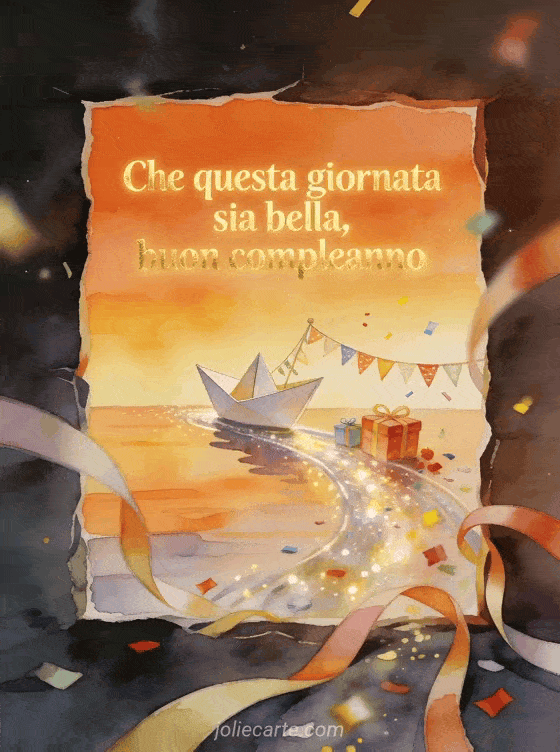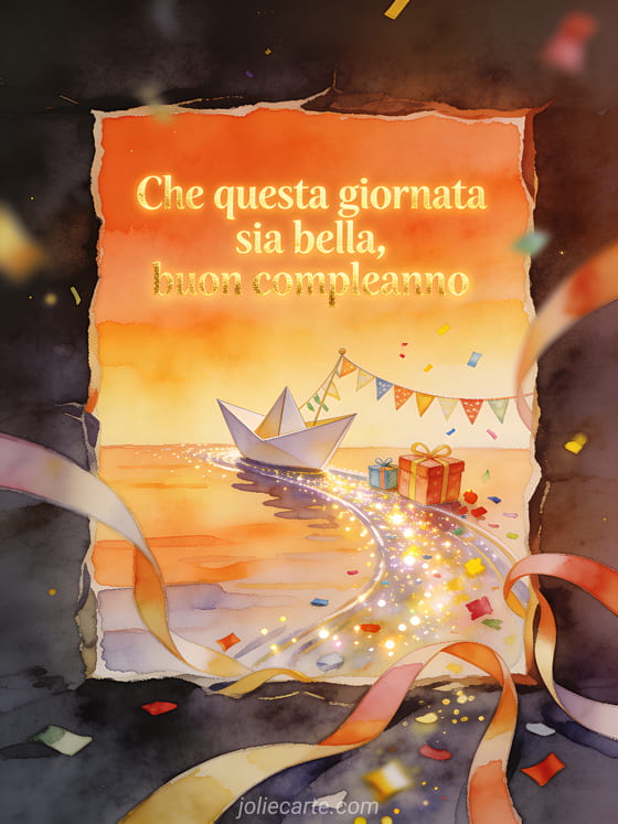 Invia a tuo figlio un augurio di compleanno affettuoso con una barchetta di carta ad acquerello che scivola su un ruscello scintillante. Festoni, piccoli regali e coriandoli rendono la scena leggera e gioiosa. Scopri anche un buon compleanno mio ometto.