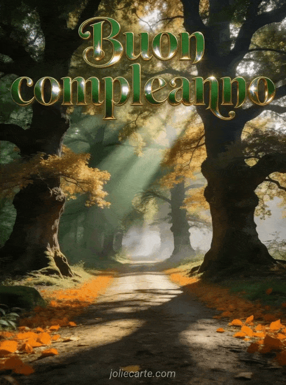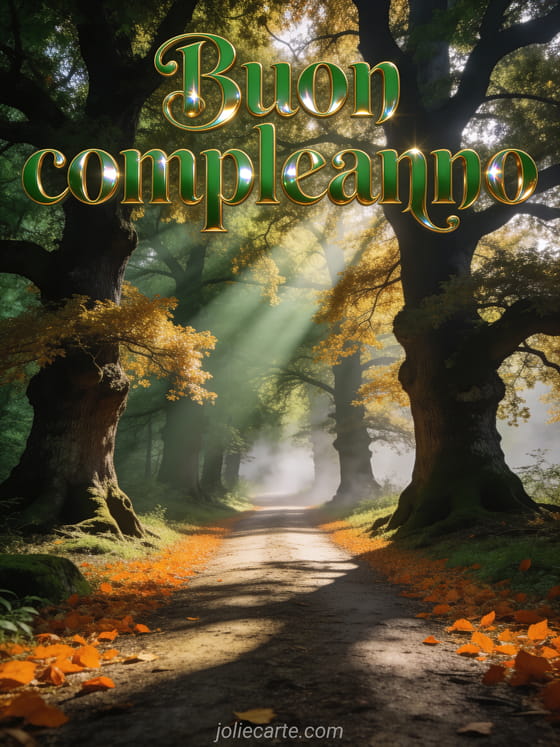 Buon compleanno Un augurio di compleanno maestoso lungo un sentiero nel bosco incantato.