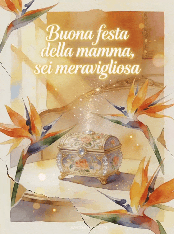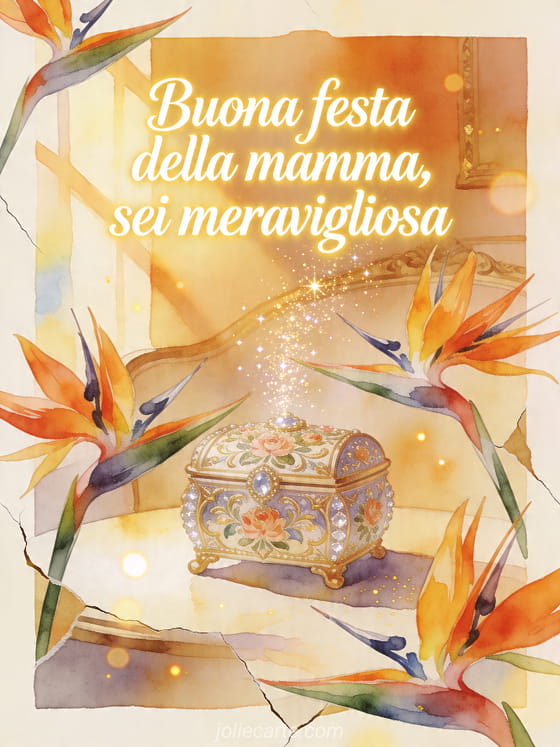 Invia un complimento per la festa della mamma con calligrafia luminosa, caldi colori ad acquerello e strelitzie intorno a un cofanetto per gioielli decorato in un salotto primaverile pieno di sole. Questo biglietto ammirato dice sei meravigliosa con eleganza e affetto. Scopri anche come augurare buona festa della mamma alla tua mamma, buona festa della mamma a una mamma defunta o biglietto festa della mamma.