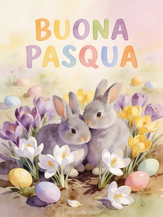 Due coniglietti abbracciati in un letto di crocus primaverili — un allegro biglietto di Pasqua da condividere con le persone care. Scopri anche Buona Pasqua immagini, buone feste di Pasqua immagini o baci buona Pasqua gif.