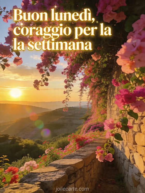 Dai motivazione per la settimana con questo biglietto luminoso che mostra una valle fiorita all'alba dorata, bouganville in cascata su un muretto di pietra e colline panoramiche. Scopri anche buongiorno lunedì divertente, un buon lunedì o buongiorno buon lunedì buona settimana baci.
