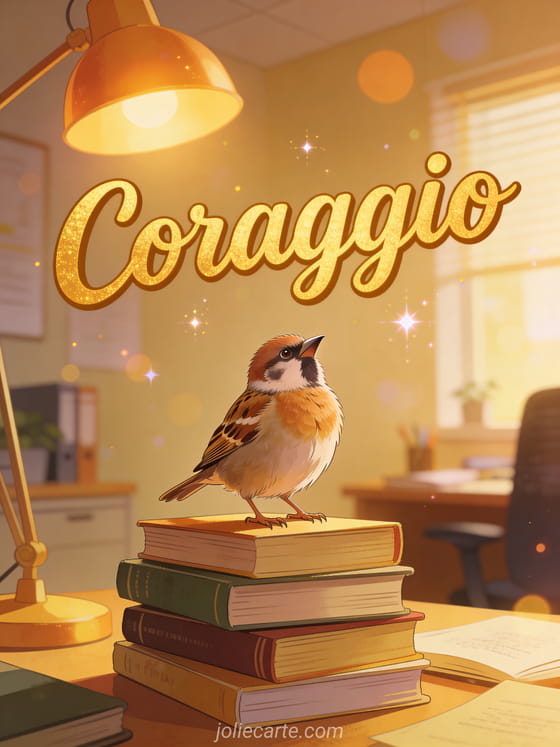 Condividi un saluto incoraggiante di coraggio con scritta dorata intensa, un piccolo passero determinato in piedi con orgoglio su una pila di libri in un ufficio accogliente con luce calda di lampada. Scopri anche un immagine di buon venerdì e buon weekend, una gif buongiorno venerdì con umorismo o una gif paesaggio buon venerdì.