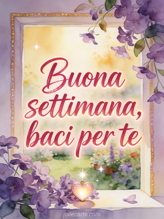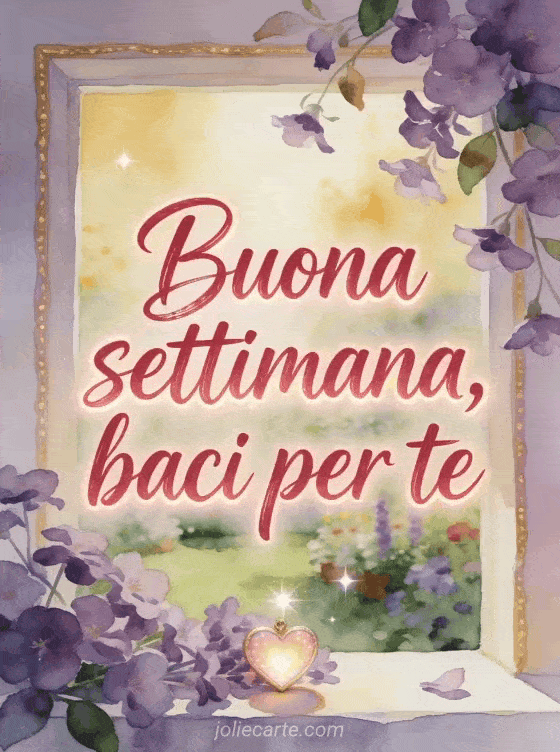 Condividi un messaggio dolce di buona settimana con calligrafia cremisi, un cuore luminoso, violette e calda luce di giardino. Scopri anche belle immagini buona settimana baci, baci tenerezza buona settimana o buona settimana a tutti baci immagini.
