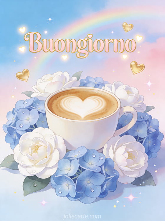 Inizia la giornata con questo romantico biglietto con una tazza di caffè latte art a forma di cuore circondata da camelie bianche e ortensie blu, un delicato arcobaleno pastello e cuori dorati fluttuanti. Scopri anche un GIF buongiorno caffè o un immagine buongiorno caffè.