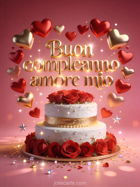 Festeggia il tuo amore con questo biglietto elegante tra cuori, rose e una torta preziosa. Scopri anche messaggio compleanno per il mio amore, biglietto compleanno tesoro e biglietto buon compleanno amore mio.