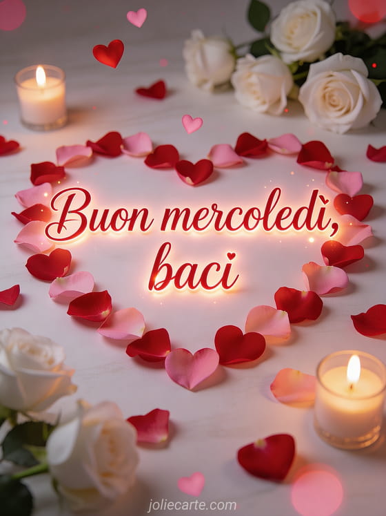 Invia baci teneri di buon mercoledì con petali di rosa rossi e rosa a forma di cuore, delicate rose bianche e calore di candele. Scopri anche buona notte e buon mercoledì, piccola immagine buon mercoledì o buon mercoledì immagini animate.