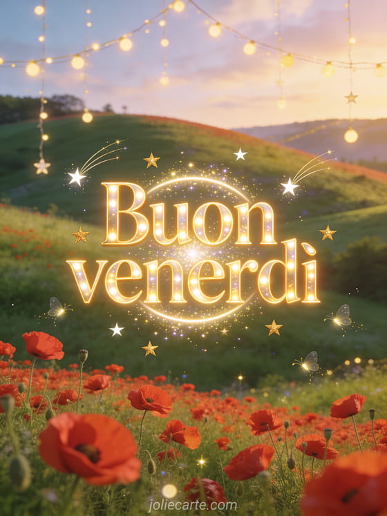 Invia una cyber cartolina buon venerdì con lettere dorate luminose, stelle cadenti e una collina di papaveri rossi sopra una valle verde. Condividi un augurio brillante di fine settimana e scopri anche belle immagini per augurare un buon venerdì, buon venerdì umorismo gif o buonissimo venerdì.