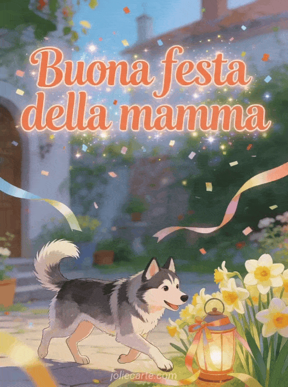 Condividi un biglietto giocoso per la festa della mamma con lettering corallo, un cane husky tra narcisi, una lanterna con nastro, festoni svolazzanti e colori primaverili brillanti. Scopri anche versi per la festa della mamma, immagini della festa della mamma o un disegno festa della mamma.