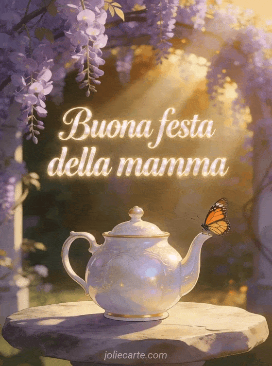 Condividi un biglietto luminoso con un pergolato di lillà all'ora dorata, una piccola farfalla monarca e una teiera in porcellana su un tavolo di pietra. Puoi inviare anche poesie per festa mamma, poesie alla festa della mamma o poesie per la festa della mamma.