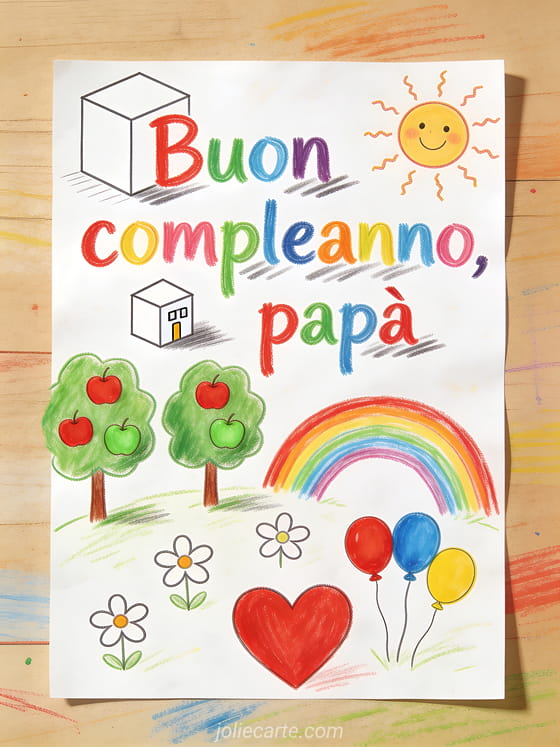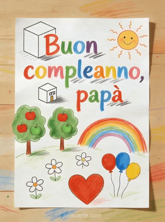 Condividi un biglietto disegno bambino compleanno papĂ con lettere colorate a matita, una casetta, sole sorridente, alberi con mele, arcobaleno, fiori, palloncini e un grande cuore rosso. Scopri anche un buon compleanno papĂ immagine, un tua figlia buon compleanno papĂ o un buon compleanno papĂ ti voglio bene.