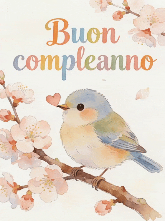 Condividi un bel disegno di compleanno con un adorabile uccellino posato su un ramo di ciliegio in fiore che tiene un piccolo cuore nel becco. Scopri anche un buon compleanno donna gif immagine o un gif compleanno donna divertente per altri auguri.