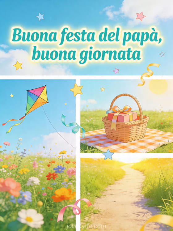 Augura a papĂ una buona giornata con un biglietto illustrato e vivace che mostra un aquilone colorato sopra un prato, un cestino da picnic con un regalo con nastro e un sentiero soleggiato tra l'erba luminosa. Questo design fresco Ăš gioioso e facile da condividere. Scopri anche biglietto virtuale Festa del PapĂ , un biglietto della Festa del PapĂ o un biglietto festa del papĂ .
