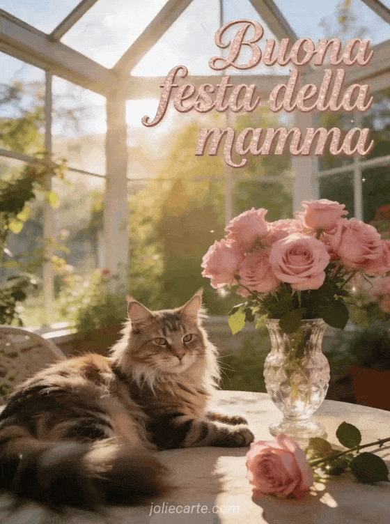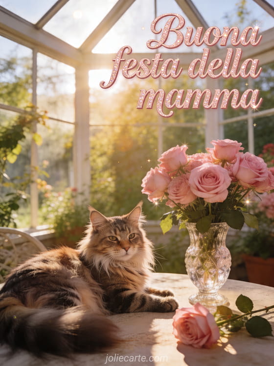 Condividi un biglietto luminoso per la festa della mamma con scrittura rosata, un gatto Maine Coon che riposa in una veranda soleggiata, rose rosa in fiore e un vaso di cristallo. Scopri anche buongiorno e buona festa della mamma, liriche per la festa della mamma o buona festa della mamma a una futura mamma.