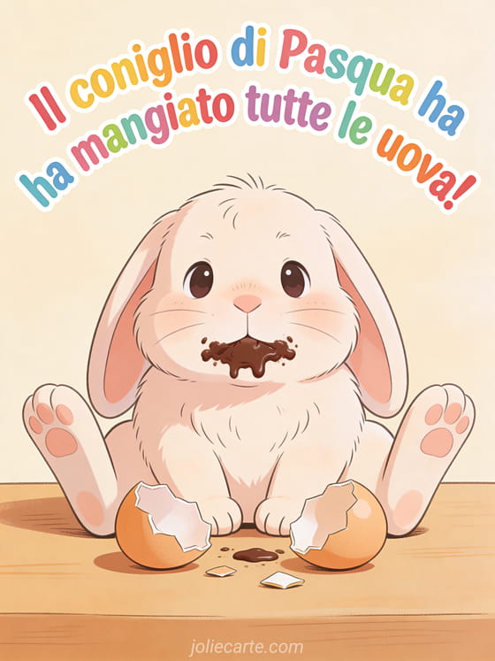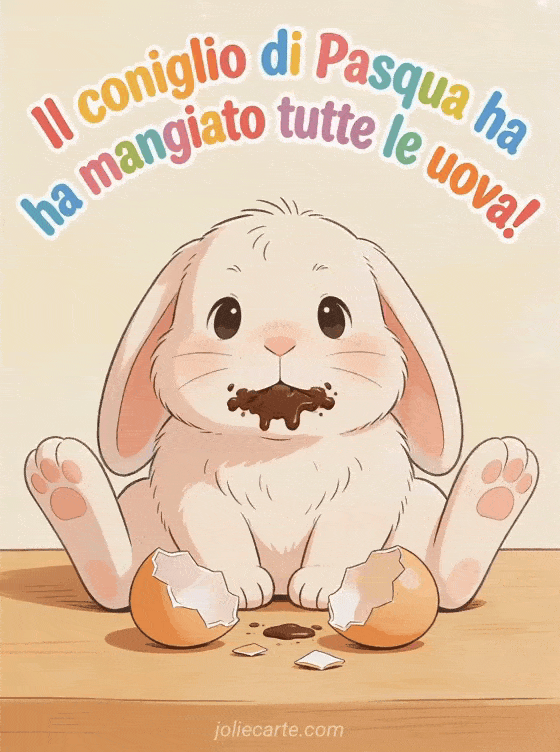 Invia un divertente augurio di Pasqua con un coniglio grassottello colto sul fatto dopo aver mangiato tutte le uova. Scopri anche un'immagine divertente di Pasqua o un augurio di Pasqua con umorismo e un biglietto di buon weekend di Pasqua.