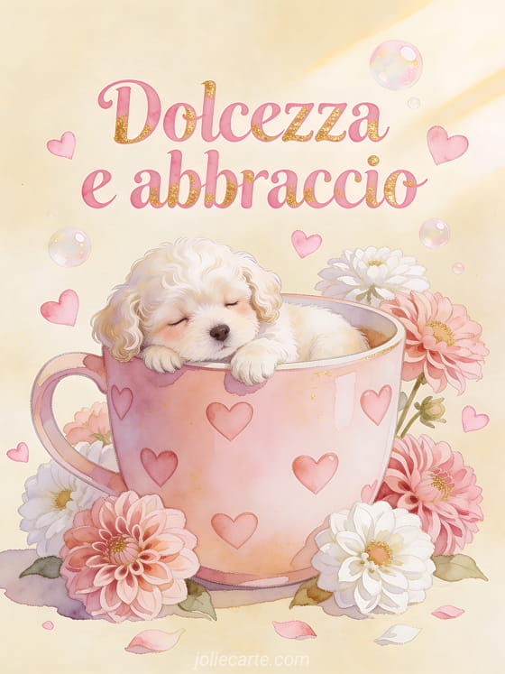 Invia questa adorabile cartolina con le parole Dolcezza e abbraccio scritte in lettere rosa cipria con effetto acquerello, con un piccolo cucciolo di bichon frisé che dorme in una tazza rosa gigante decorata con cuori, circondato da dalie rosa e bianche. Scopri anche una citazione abbraccio tenerezza o una tenerezza gif abbraccio conforto.