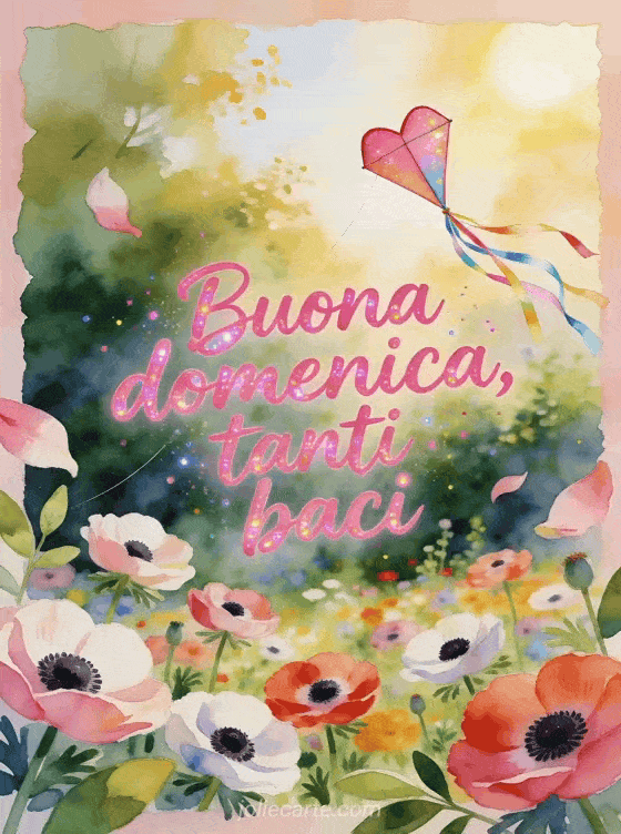 Invia buona domenica, tanti baci con scrittura rosa vivace, un aquilone a forma di cuore sopra un giardino luminoso di anemoni e nastri colorati. Scopri anche buona domenica gif religioso, biglietti per augurare buona domenica o buona domenica piovosa immagine.