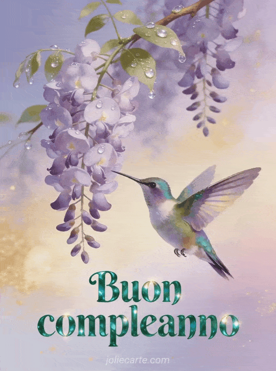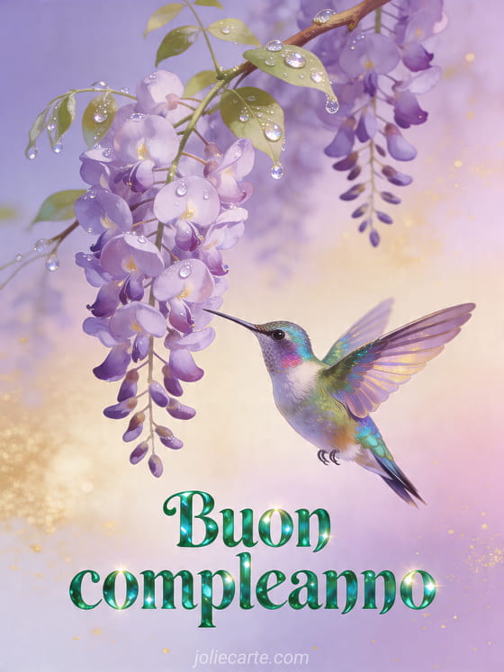 Condividi un luminoso buon compleanno con questa delicata cartolina con un colibrì iridescente accanto a un glicine in cascata. Puoi anche scoprire una cartolina animata gratis compleanno fiori, un dromedario biglietto compleanno animato gratis musicale via sms o una candelina compleanno gif animata.
