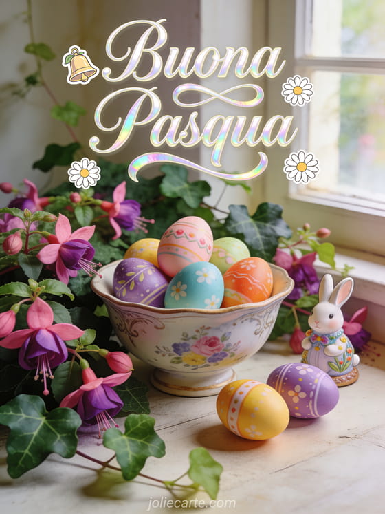 Condividi una splendida e-card di Pasqua con questa nostalgica natura morta vintage di uova di Pasqua dipinte circondate da fucsie ed edera. Scopri anche Buona Pasqua GIF animate gratis o una gallina di Pasqua.