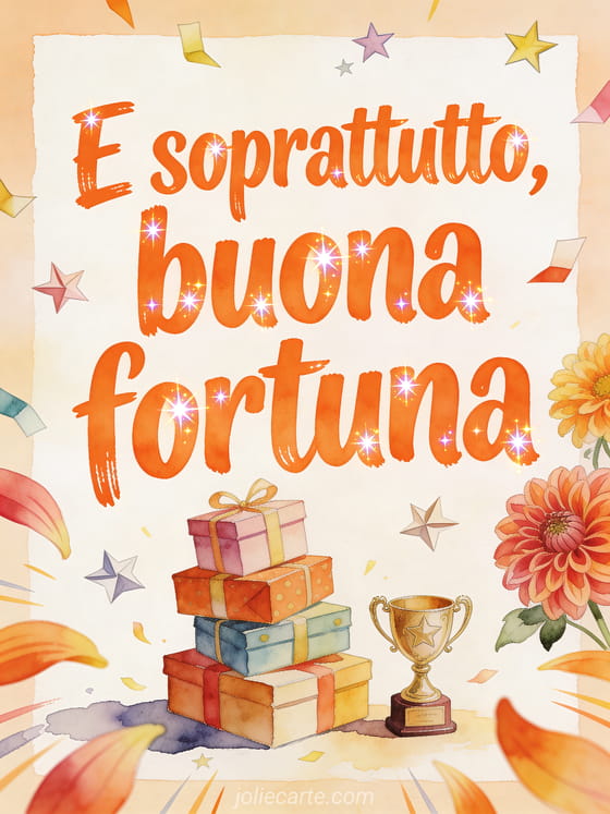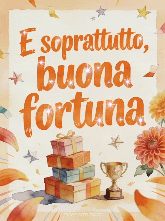 Invia e poi soprattutto buona fortuna gif con scritte arancioni, scatole regalo traballanti, un piccolo trofeo portafortuna, dalie e stelle di carta volanti. Scopri anche una foto animata buona fortuna, una buona fortuna a tutti immagine o un messaggio per augurare buona fortuna a qualcuno.