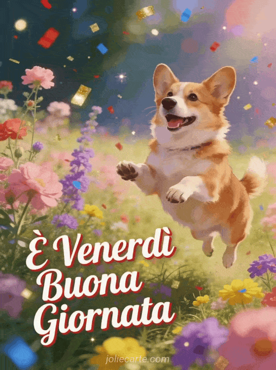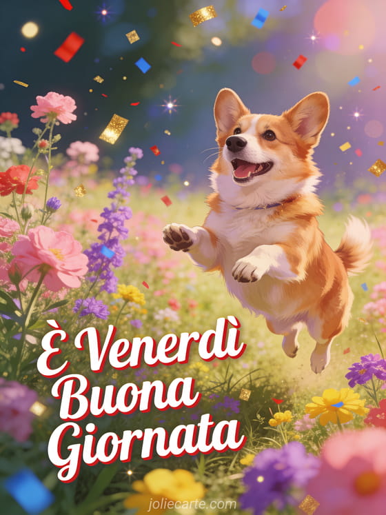 Festeggia il fine settimana con questo allegro biglietto di venerdì. Un corgi felice salta di gioia in un campo di fiori selvatici colorati in un'atmosfera festiva di celebrazione. Scopri anche un biglietto gif divertente di venerdì o un biglietto di buongiorno venerdì baci.