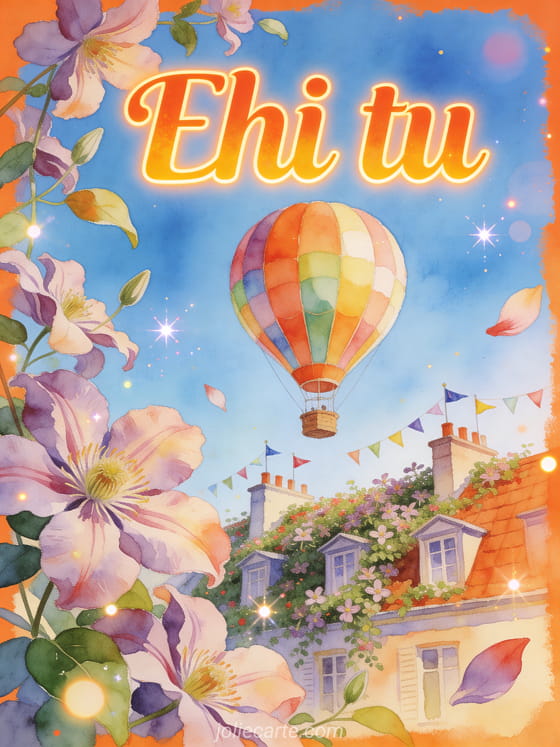 Invia una cartolina gif ehi tu con una mongolfiera colorata che fluttua sopra tetti coperti di clematidi. Scopri anche una ciao buona giornata gif, delle immagini di ciao buongiorno o un buongiorno ciao gif.