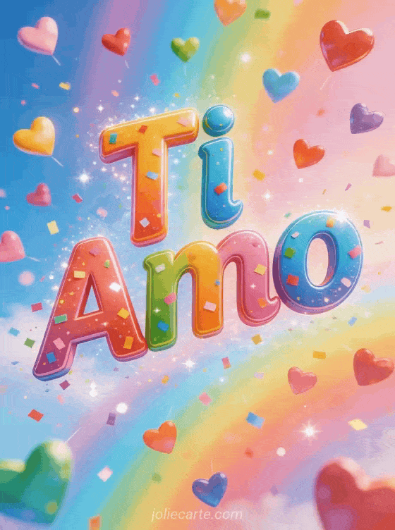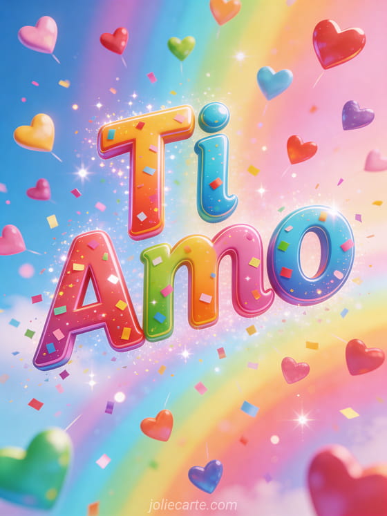 Invia questo gioioso biglietto con una pioggia di cuori colorati che cadono dal cielo su un luminoso sfondo arcobaleno pastello. Scopri anche un biglietto anch'io ti amo o un biglietto ti amo all'infinito.